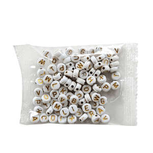 Innhold: ca 100 stk 7 mm acrylperler i transparent hvit med gull bokstaver. Assorterte bokstaver